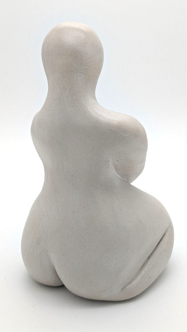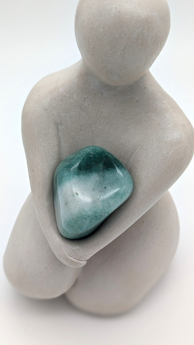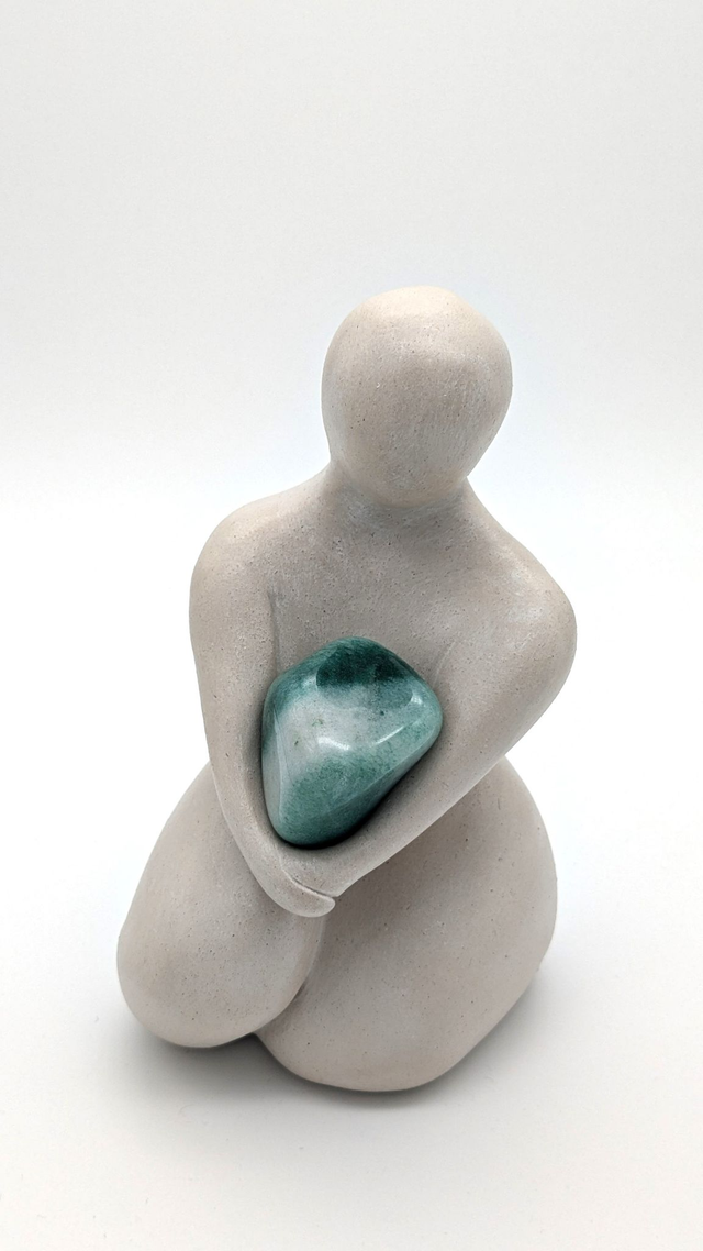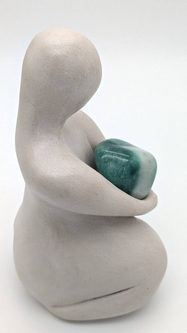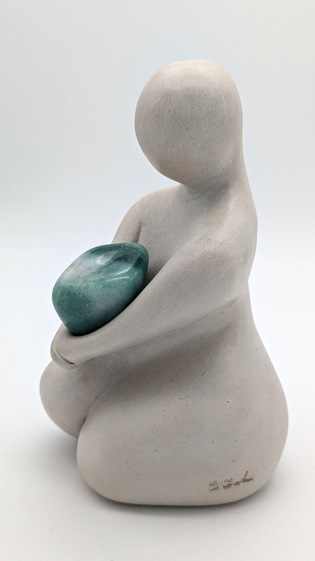 La terre blanche a rencontré une aventurine pour donner naissance à Neyti. Une sculpture qui, de prime abord, m'évoque la joie tout en révélant rapidement un sentiment d'enfermement. Neyti t'invite à dépasser les douleurs du passé, la jalousie et t'accompagne dans le pardon. Elle te dit "Regarde plus loin et largue les amarres vers l’avenir".